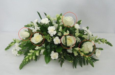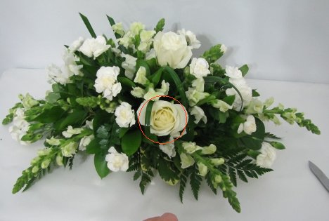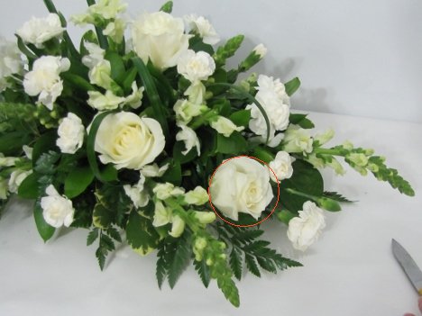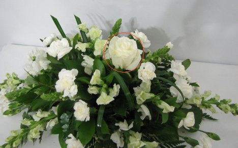 Focal flowers are usually the largest flower in the design. Roses are generally very cost effect and come in a multitude of colors. Don't feel like just because this design is all white that those are the only thing you can use to duplicate this design.