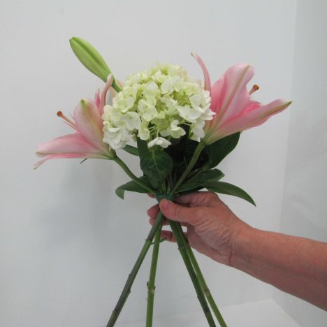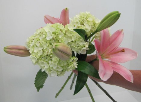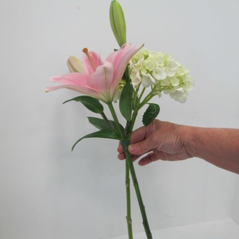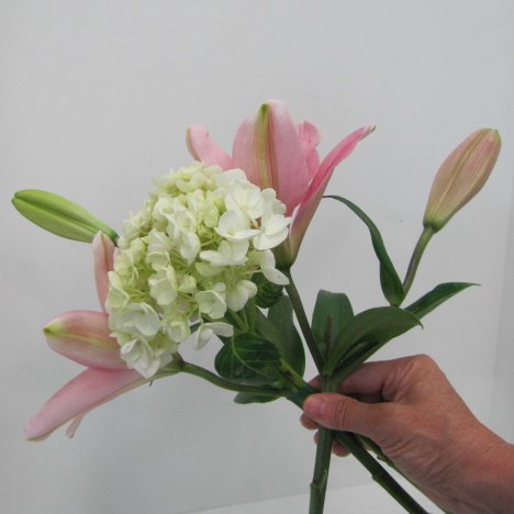 Oriental lilies often have a "V" gap between the flower heads on a single stem. I filled in that gap with the large mass of the hydrangea bloom.