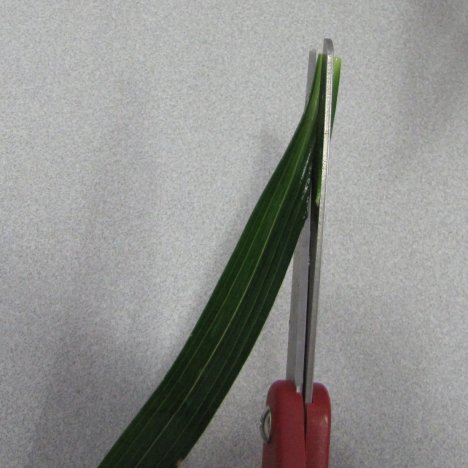 I help the grass insert into the foam easier by cutting the shortened grass to a pointed end with scissors. In this case, scissors work better than a floral knife.