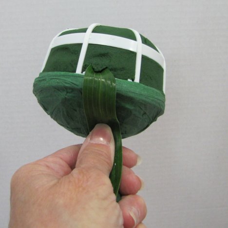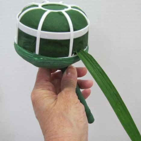 I then gently work the cut end into the foam, right above the outer bottom rim of the bouquet holder.
