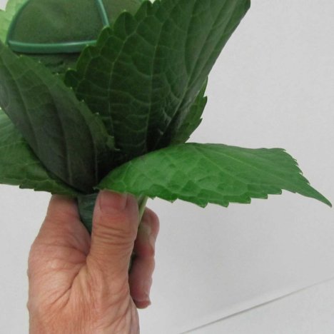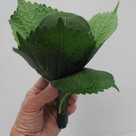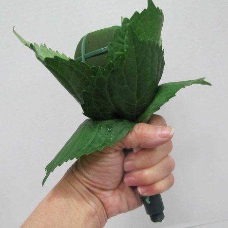I continue to add more hydrangea leaves around the base of the Belle straight bouquet holder.