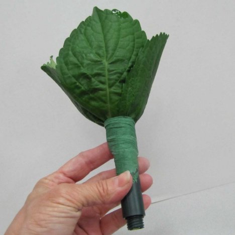 This hydrangea bridal bouquet is going to be beautiful from top to bottom. That means making the design mechanics invisible. Continue to add more hydrangea leaves around the foam of the Super Wet bouquet holder. Allow the leaves to "cup" the foam and then tape into place.