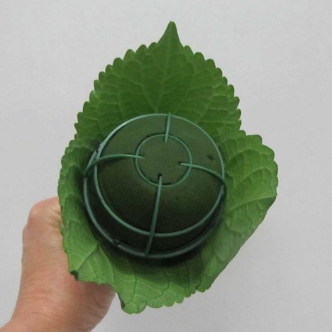 The leaves will frame around the foam cage, creating a finished look from the underside of the bouquet.
