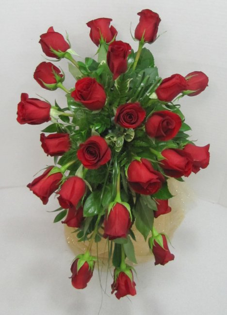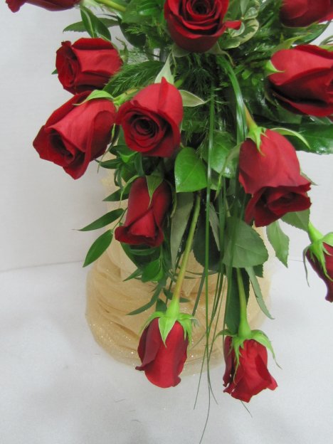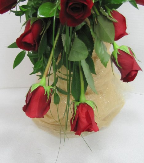 This red rose wedding bouquet isn't finished yet! I'm going to go around and fill in between the already set roses. The roses I set in the back are going to face even more away from the front of the bouquet.