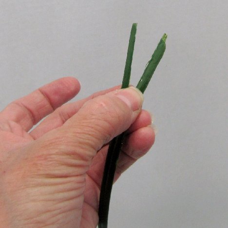 Tape into place, going up a little high on the back of the leaf if necessary to fold the leaf tightly against the flower stem.