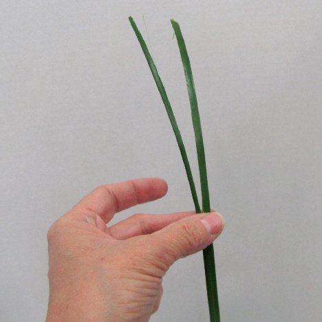 Simply use your knife or fingernail to start a split at the top of the blade of lily grass.