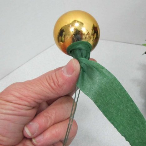 Use florist tape, starting winding it at the very base of the ornament and the pull it down tightly as you wind it down around the wire stem.