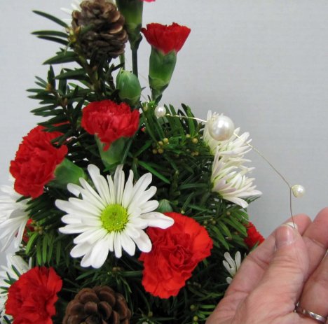 Now let's add an elegant touch to the center of the daisies with pearl headed pins.