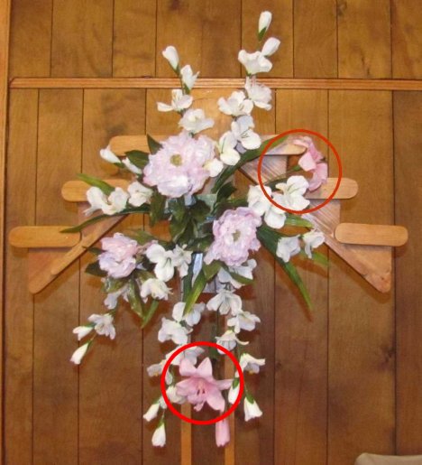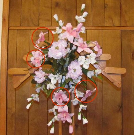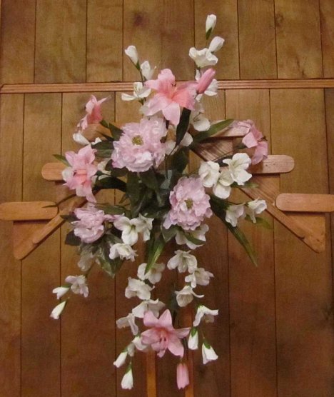 This church decoration idea is easy to incorporate changes such as using your own personal flower choices and color scheme. The basic tutorial remains the same, regardless of the flower or colors used. I used larger Asiatic lilies, first adding one on the bottom and the next facing the upper right side.
