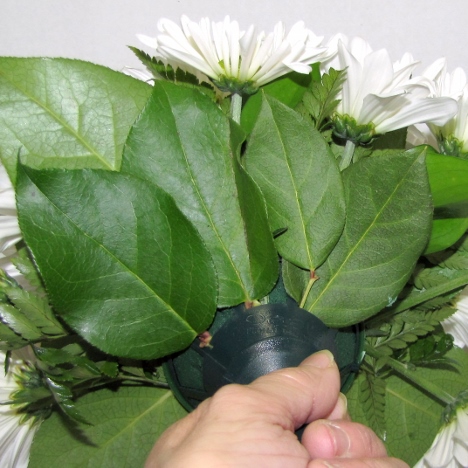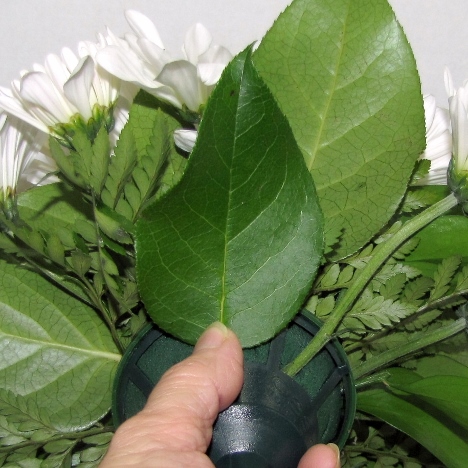 Insert the leaves into the foam slots under the bouquet facing right side downward. You don't want to see the "wrong" side of the leaves if you look under the bouquet head.