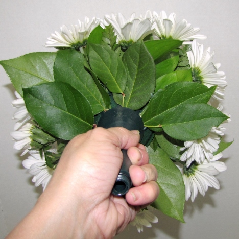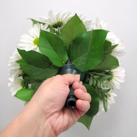 Daisy wedding bouquets have lovely long stems, so long I can use them to conceal the bouquet handle. The goal is to completely cover the mechanics of the bouquet, so the wedding guests will never suspect that this isn't a true hand tied design.