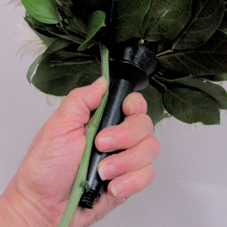 Cut the top of the stems at a sharp, diagonal angle that will insert upwards into the leaves in the underside of the bouquet design.