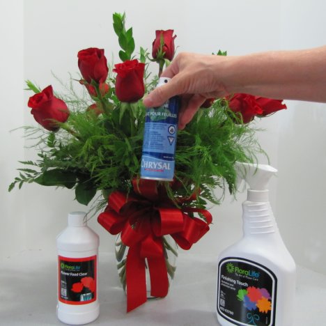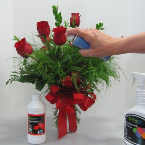 Never forget the final step of misting your finished design with a flower sealant such as Crowning Glory. This seals the petals and keeps air conditioning or heat from robbing those petals of moisture of both the flowers and the greens.