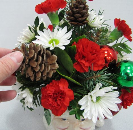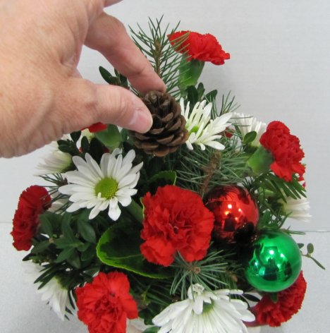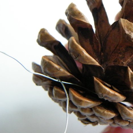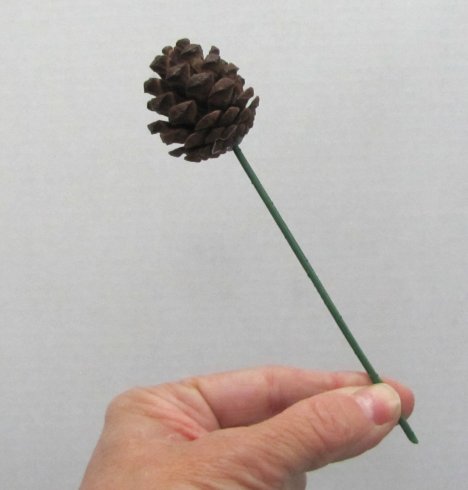 I'm also going to add some smaller sized pine cones. These are already pre-wired, being cut apart from some of the Christmas picks.