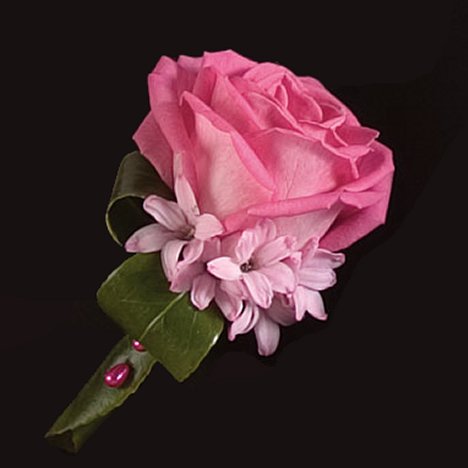 Wire rose and two of three leaves, looping one leaf by folding it under. Wrap third leaf around stem and secure with pins. Pin leaves down. Glue in hyacinth blooms. Spray entire arrangement with Clear Crowning Glory or Finishing Touch Flower Sealant, making sure to completely coat the fronts and backs of the flowers. Refrigerate until delivery.