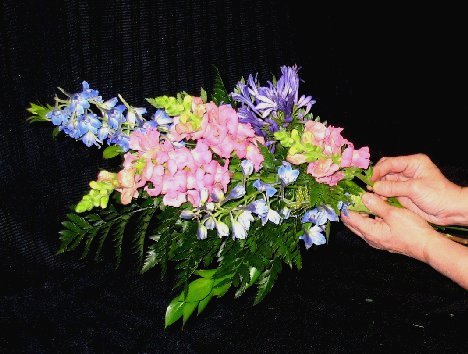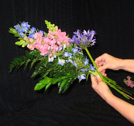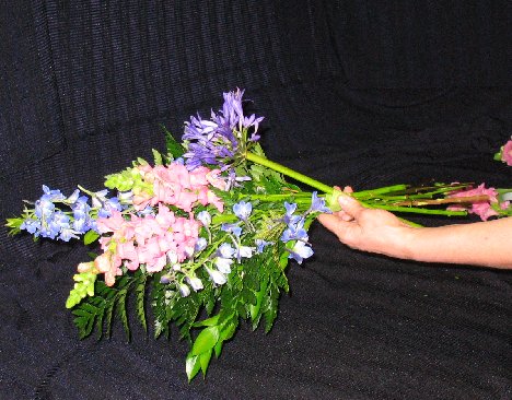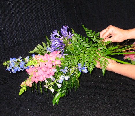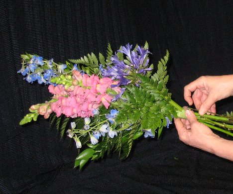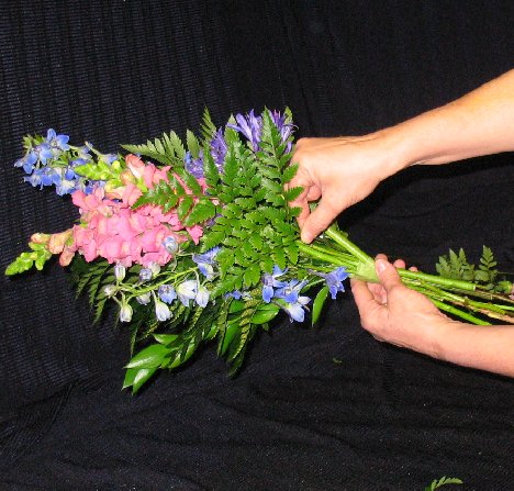 I gently lay another stem of leather leaf fern at the bottom, taking care that it doesn't cover up any of the heads of these lovely flowers.