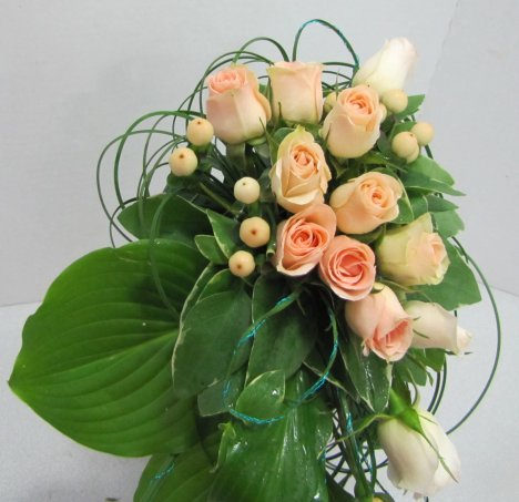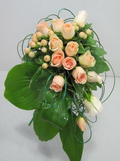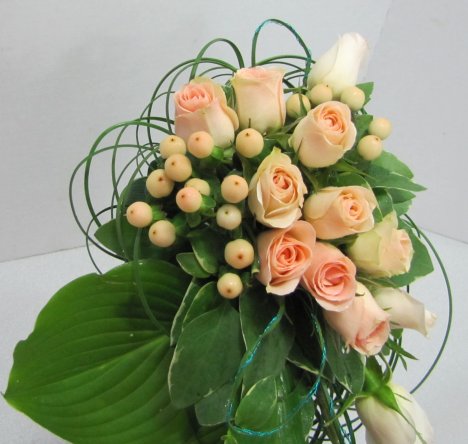 I tuck the hypericum a little deeper into the design, allowing the spray roses to be the dominant flower in this bouquet.