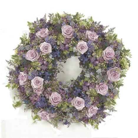 This lovely lavender flower wreath is filled with fragrant roses, larkspur and delphinium. If you wish to create a similar design, you'll need the following products and fresh flowers: