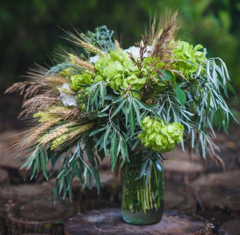 You can make your own bridal bouquet similar to the picture below with the following flowers and greens: