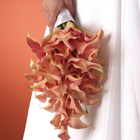 Ribbon wrap to conceal mechanics of the bouquet. Spray entire arrangement with either Finishing Touch or Crowning Glory, making sure to completely coat the fronts and backs of the flowers. Refrigerate until delivery. Don't rest the cut ends in more than two inches of water. Trim off any soften portion of the calla stems each day. On the wedding day, cut the stems to the desired length.