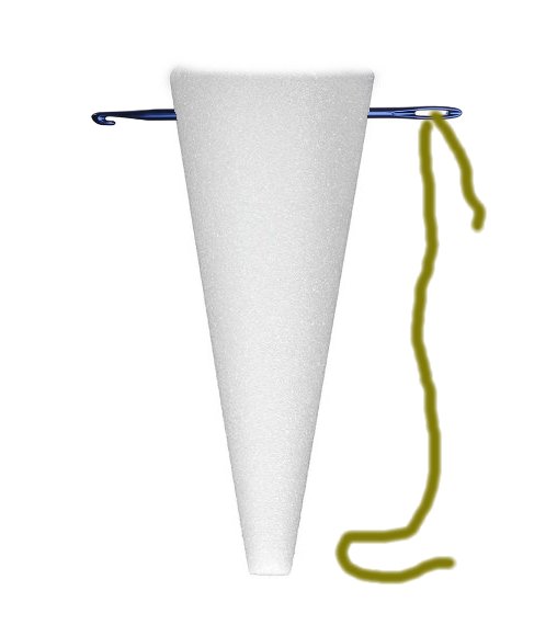 You need to plan how to hang your pew marker, you will need to drill a hole through the upper portion of the styrofoam cone. I use a long crochet hook, using the hook end to pull a length of yarn through. Tulle works quite well, also, as it is strong and can be used as a tie to create a handle that hooks over the pew arm.