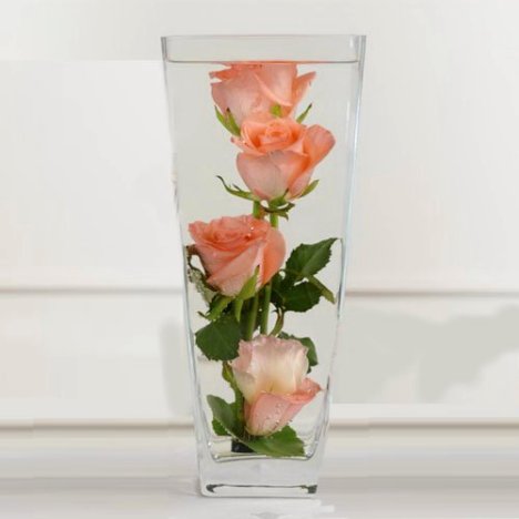 This arrangement of roses is very simplistic, seemingly suspended in water, these roses stay in place. In actuality, all flowers tend to float, so they need to either be anchored in place with a metal frog pin or suspended in clear gel water beads.