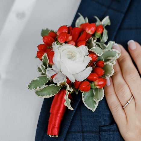This cheery boutonniere has bright hypericum berries that work equally well for summer or winter. To design a similar boutonniere, you will need the following fresh flowers and greenery: