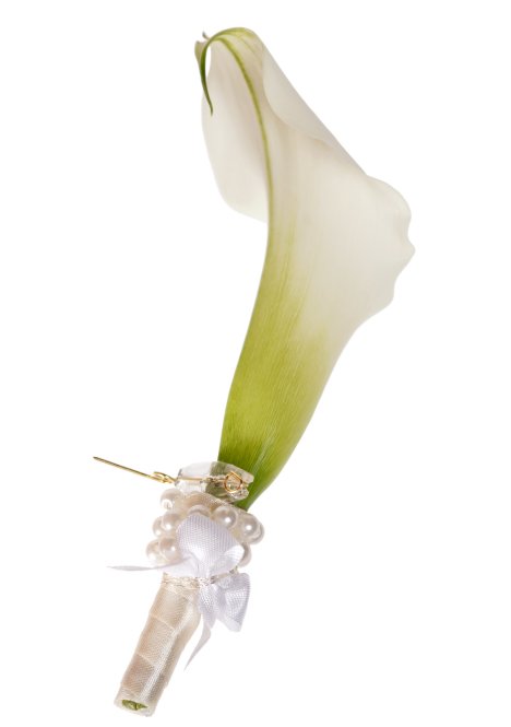 Use white stem wrap to fasten the Boutstix or Brooch Pin to the back of the calla lily. Ribbon wrap the bottom with white satin ribbon and finish with a simple bow tie. Wrap the top of the ribbon with ivory pearl garland.