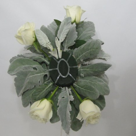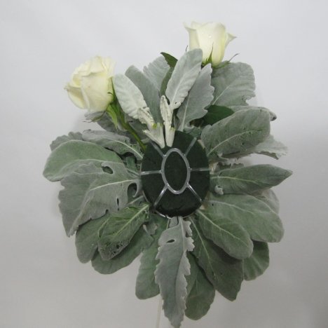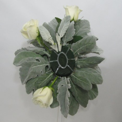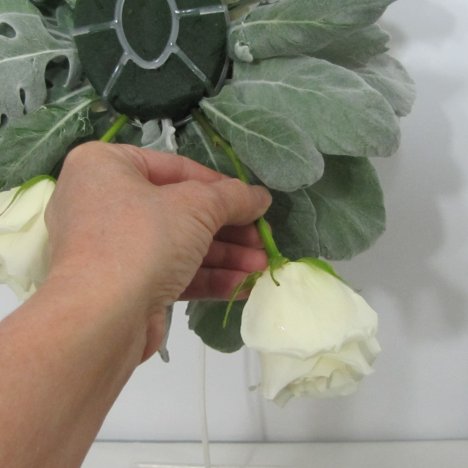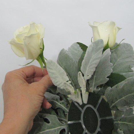 Insert the flower stems in about an inch or so. Not deep enough and the flower won't hold fast into the foam. Inserting too deeply begins to cause the stems to clash and hit inside the foam and start to degrade the integrity of the foam.