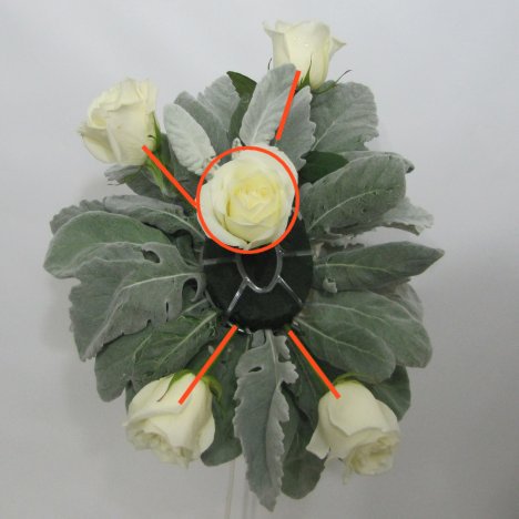 Note the placement of all four roses. All the outer roses face up or down and outwards.