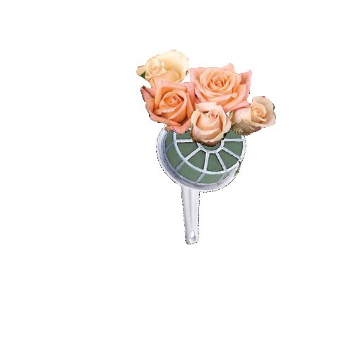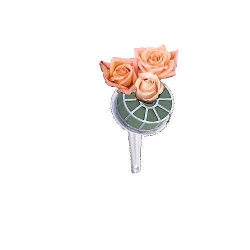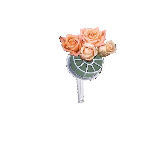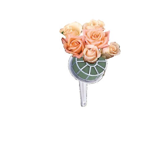 Cut the stems off the roses. Clean of thorns and lay aside. Cluster the roses inserting the stems in the topside and upper portion of the Lomey Bouquet Holder. Insert the stems of the millet and wheat around the holder, keeping the backside of the bouquet flattened.