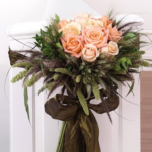 These aisle decorations are made of soft peach roses with a lovely collar of green wheat, ornamental grasses and myrtle. It's finished off by tying with a decorative bow. This looks like a hand tied bouquet, but it is easier to get the right flower placement if you design it on a bouquet holder. To create a similar look, you'll need the following hard goods and fresh flowers: