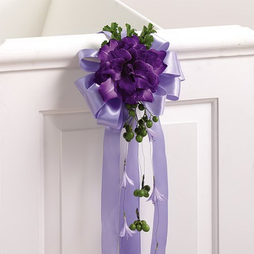 Colorful aisle decorations make a bright addition to church wedding decor! This lovely bow is accented with a cluster of purple gladiolus blooms. To create a similar look, you'll need the following hard goods and fresh flowers: