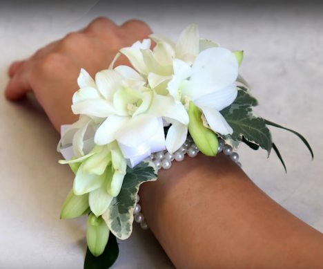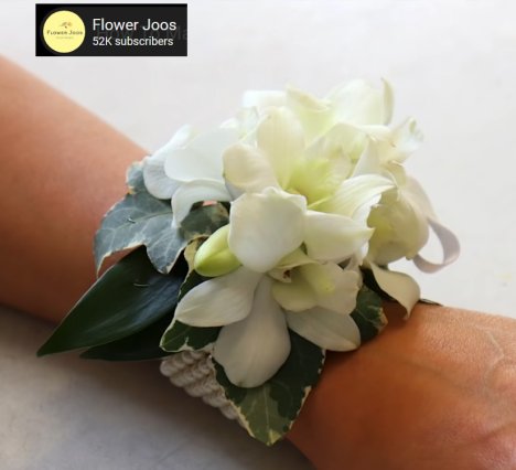 Take a few minutes to watch this simple video before choosing a bracelet. This tutorial creates a lovely rounded corsage that fits nicely to the wrist. It reminds me of how we in the United States usually make a halo to be worn on the head . . . except in a diminutive size for the wrist! It is a little more labor intensive, as it is wiring and taping rather than gluing the flowers directly to the wristlet.