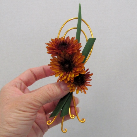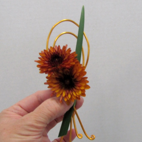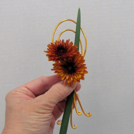 I leave one up trailing upward, so it looks like it is coming down off that looped wire above. Glue into place with floral adhesive.