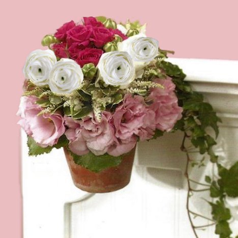 If you use a traditional clay pot, take care that you secure it well to the pew with heavy duty pew clips so it won't fall to the aisle during the ceremony, as flowers and clay are a heavy combination. Be sure to line the clay pot as it will have a hole at the bottom. Either plug it with florist clay or use some type of liner so water doesn't drip out onto the carpet.