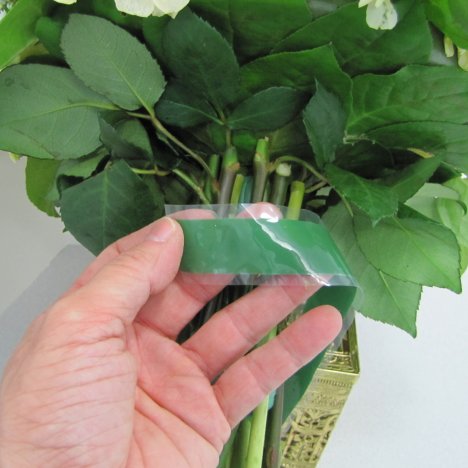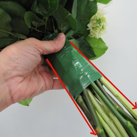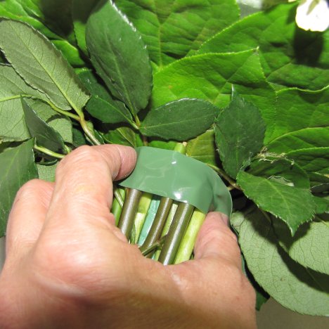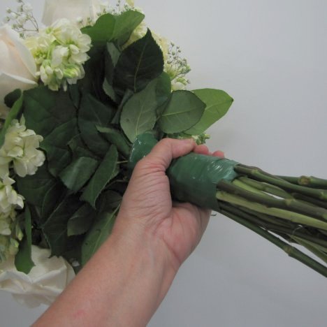 Start at the top part of the stems directly under the base of the bouquet holder. Use the tape to conceal any cut ends at this point.