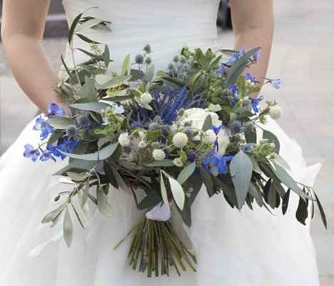 This blue wedding bouquet is a delightful mix of blues and soft sage greens. Designed as a spiral hand tie, the casual design is made up of flowers in asymmetrical design. If you haven't designed flowers before, read through the beginning galleries for Spiral Hand tied bouquets. Those tutorials will show you different ways to create this particular look.