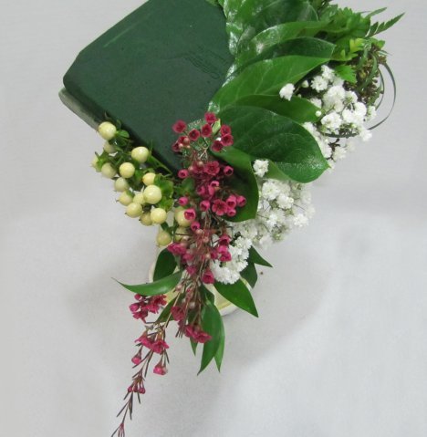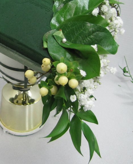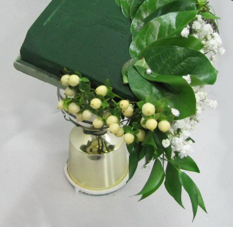 Again, a good flower designer makes sure to cover up the mechanics of foam and the plastic portion of the holder.