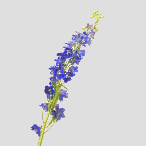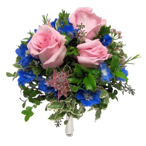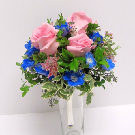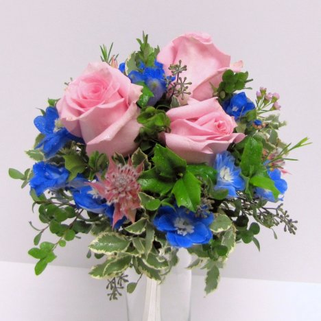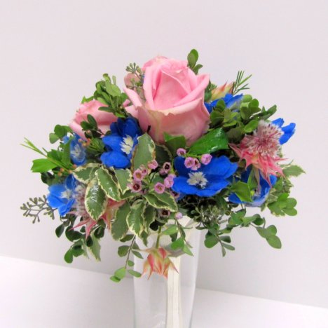 I now add the secondary flower of bright blue delphinium. They are individual florets clustered on a long central stem. I cut the single stalk into several pieces, using them as an accent around the pink roses.