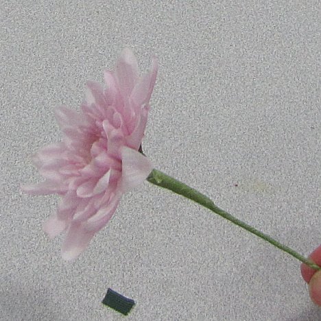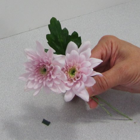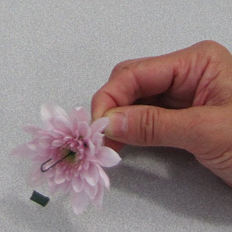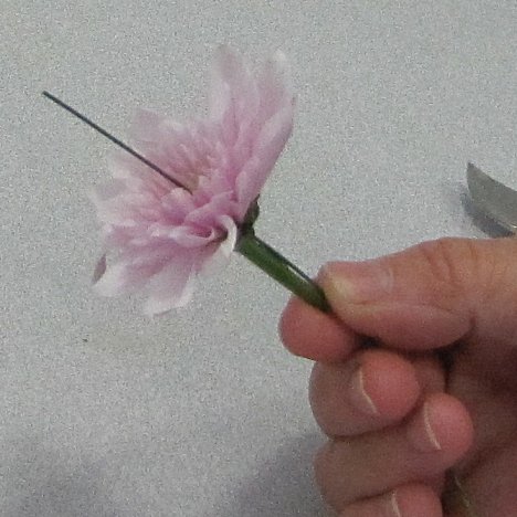 Repeat the first step of this tutorial on how to make boutonnieres by wiring a second pink mum. Lay the wire next to the stem and push it up thru the center of the flower head.