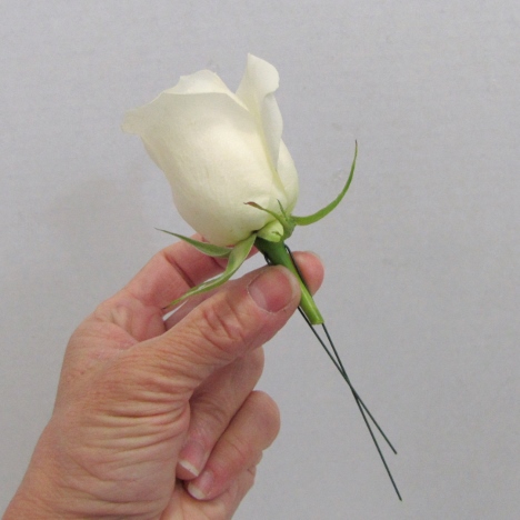 Insert a 26 gauge wire sideways into the thick bulb part of the rose, right below the flower head.