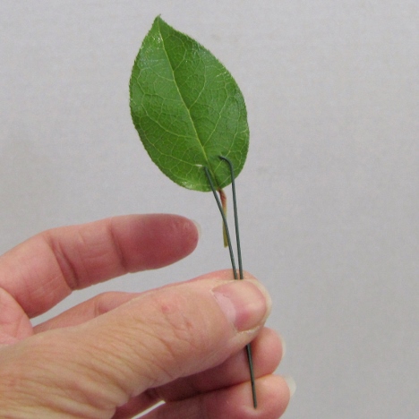 Place your thumb and forefinger and pinch tight where you pierced the leaf. Then fold down the two wires parallel to the stem.