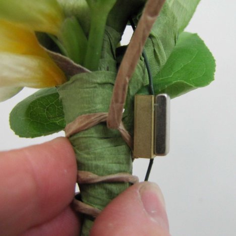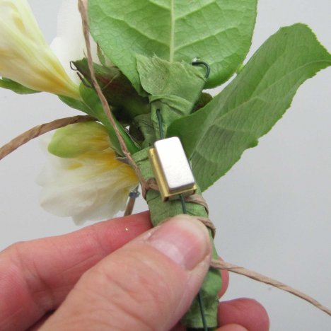 The attached wires makes it very easy to incorporate the magnet into the design. I actually pierced through the florist tape on the leaf and hooked it.