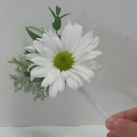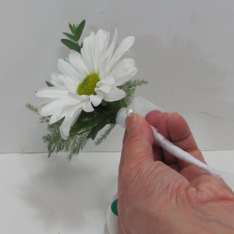 A layer of ribbon over the boutonniere taped stem will peek out white under the wire wrap. I'm using a sheer white ribbon to give a polished finish to this daisy boutonniere. Start at the top and wrap the ribbon around, securing the end by wrapping the ribbon tightly around it.