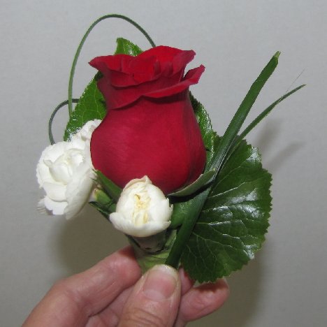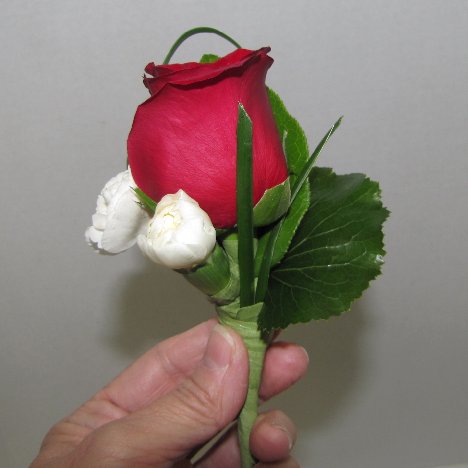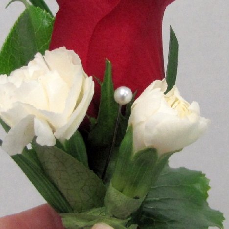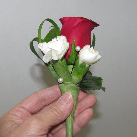 Make sure all sharp ends are buried deep into the flower heads or stem so no sharp points stick out the back of the boutonniere.