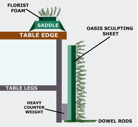 Here's what a side view looks like. You begin by greening in the saddle on top of the table. Keep the top of the design very short, as you don't want it blocking the view of the bride and groom when they are seated at the bridal table.