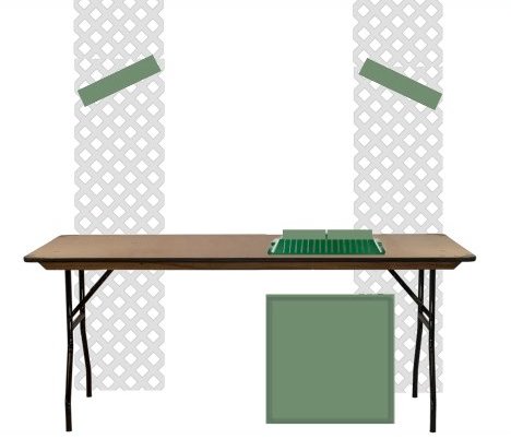 The heavy counter weight (cinder blocks, bags of flower - anything that can fit under the table and sit on top of the dowel rods coming out behind the standing sculpting sheet) will be under the tablecloth, acting as a counterweight to the flowers and greens on the front of the sheet.