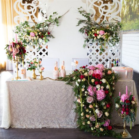 The basic mechanics are broken down as two raquettes on the backdrop, Two wedding candelabras (one on the table and one on the floor) assorted wine bottles and small nosegay vases and one large waterfall arrangement spilling over the table.