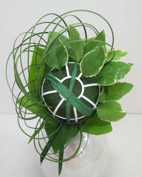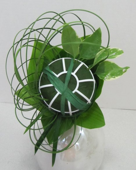 Continue inserting these smaller leaves into the design, filling in the florist foam.